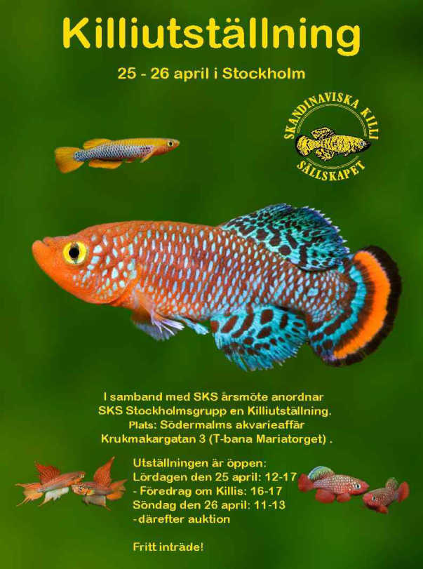 I samband med årsmötet anordnas en mindre Killiutställning i Södermalms Akvarieaffär 25 - 26 april. Öppettiderna kommer att vara lördag 12-17 och söndag 11-13 och därefter auktion.